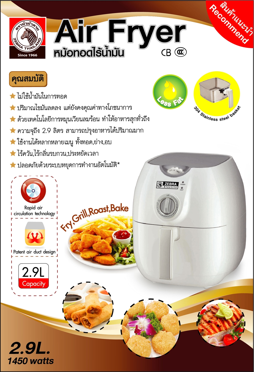 อร่อยง่ายๆได้สุขภาพ กับหม้อทอดไร้น้ำมัน Air Fryer ZB-AF1450 ด้วยเทคโนโลยีการหมุนเวียนลมร้อน ช่วยให้อาหารสุกทั่วถึง โดยไม่ต้องใช้น้ำมันในการทอด ลดปริมาณไขมันในอาหารที่ปรุง แต่ยังคงคุณค่าทางโภชนการ มาพร้อมตะแกรงทอดผลิตจากสเตนเลสเกรดคุณภาพ SUS304 จะทอด ย่าง หรืออบ ก็อร่อยทุกเมนู...